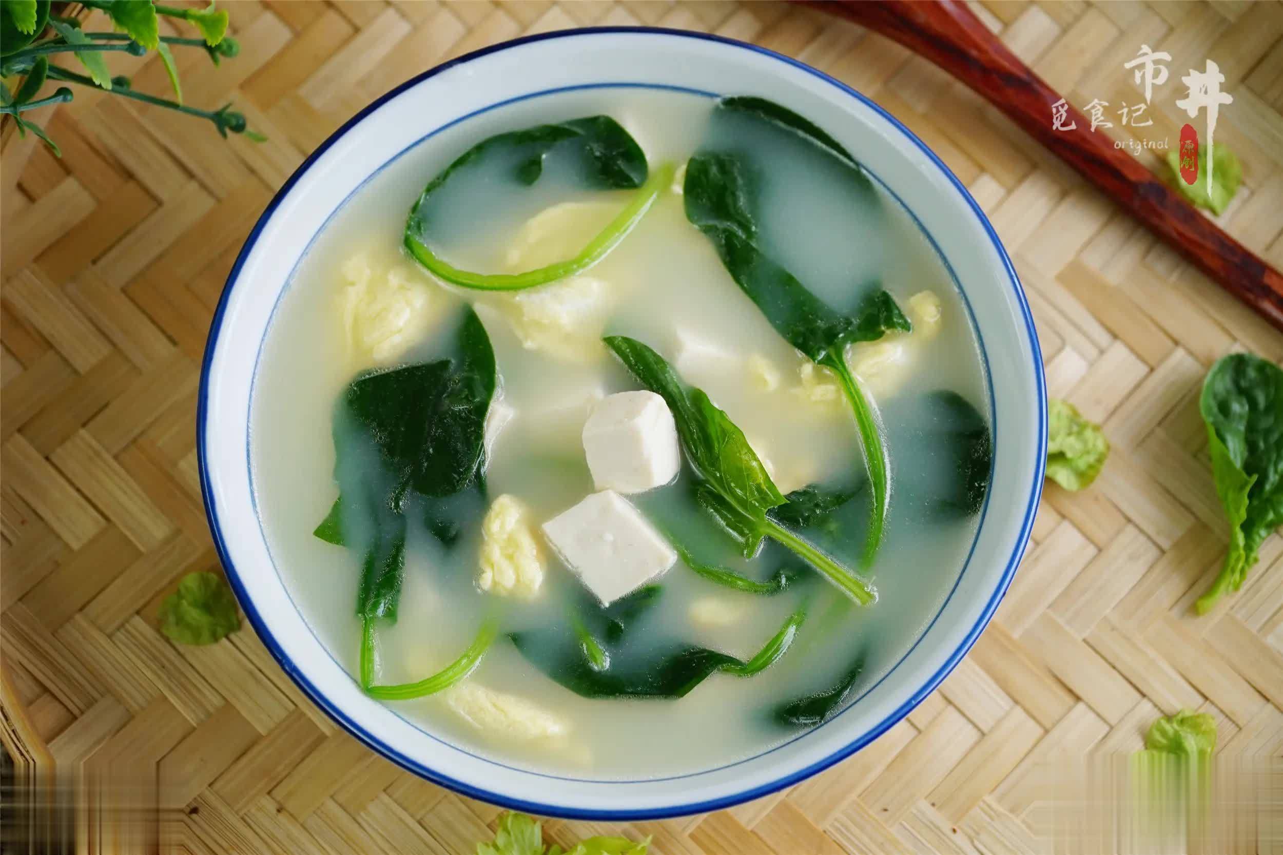 二、菠菜豆腐鸡蛋汤食材:菠菜 200 克、嫩豆腐 1 块、鸡蛋 2 个、葱花适量、盐、香油、白胡椒粉、食用油各少许。